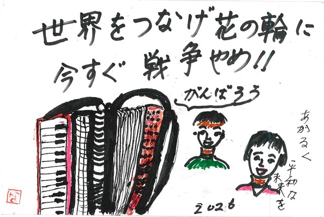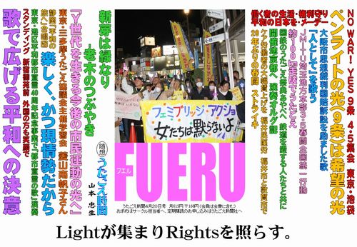 その様子はYouTubeでご覧ください。 皆さんの市区町村の「平和都市宣言」に曲をつけてみませんか、と8面で呼びかけています。 |