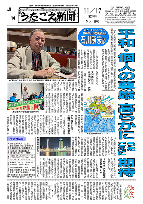 長崎県合唱連盟長崎支部の事務局次長をされています。左上写真は、長崎県合唱連盟第52回合唱祭で、高校生18人を含む50人余の合唱団による演奏。5月3日の「9条フェスタ」でも、この曲が演奏されました。この曲の背景などを今号のうたごえ新聞ではTOP記事としてお伝えしております。