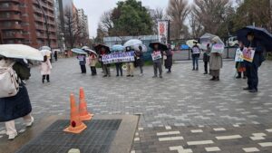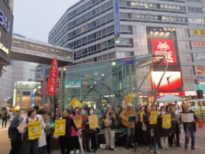 | 日中友好協会都連主催の「No War on Iran 殺傷兵器の輸出やめよ!」の緊急宣伝行動が東京・新宿御苑前で取り組まれました。雨の中、三多摩青年合唱団の二人が参加して、創作曲「Stop War!」などを演奏。 場所柄、外国人が多く、訴求力も大きかったようです。 |