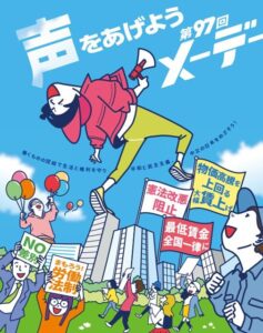 | 2026メーデー歌集に掲載されている「全国一律!サンバDE サイチン」 2000円を目指そうという歌詞ですが、これは最低賃金の話であり、実際のストライキの現場では、その要求に合わせて目標額で歌詞を変えているそうです。 |