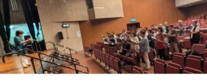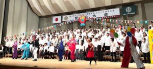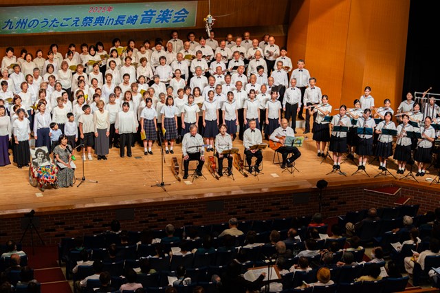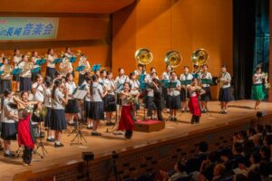 祭典実行委員長は田中重光さん。日本被団協の代表委員さんで、昨年の佐賀での日本のうたごえ祭典でも大音楽会でノーベル賞受賞の喜びを語っておられましたね。 | 本紙でも度々登場している活水中学校・高等学校の吹奏楽部の演奏。 |