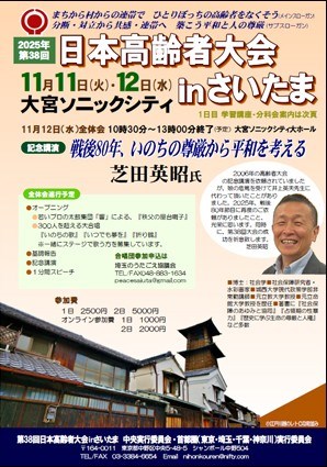 日本高齢者大会、今年は2505人収容できる埼玉・大宮ソニックシティで開催されます。埼玉合唱団から、オープニングで「いのちの歌」「いつでも夢を」「折り鶴」を一緒に歌いませんか、と呼びかけ。詳細は3面で。 | ![]() |