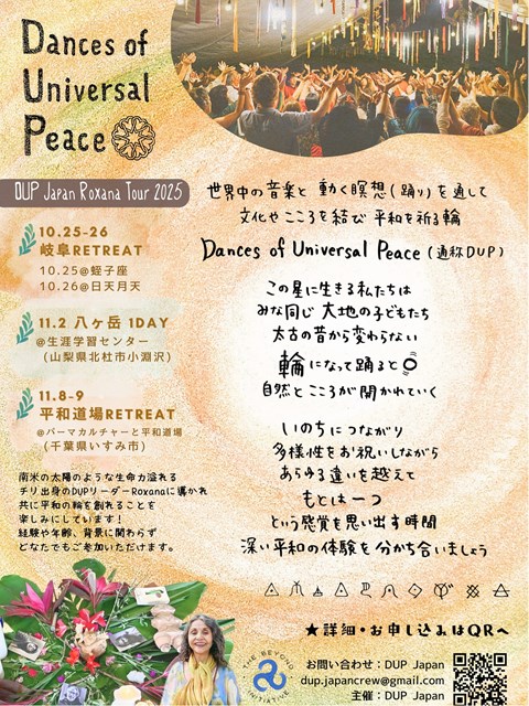 世界中の音楽と動く瞑想(踊り)を通して 文化や心を結び平和を祈る輪 Dance of Universal Peace 岐阜、山梨、千葉などで開催されます。 詳細は3面とこちらで。 紹介サイトはこちらです。 |