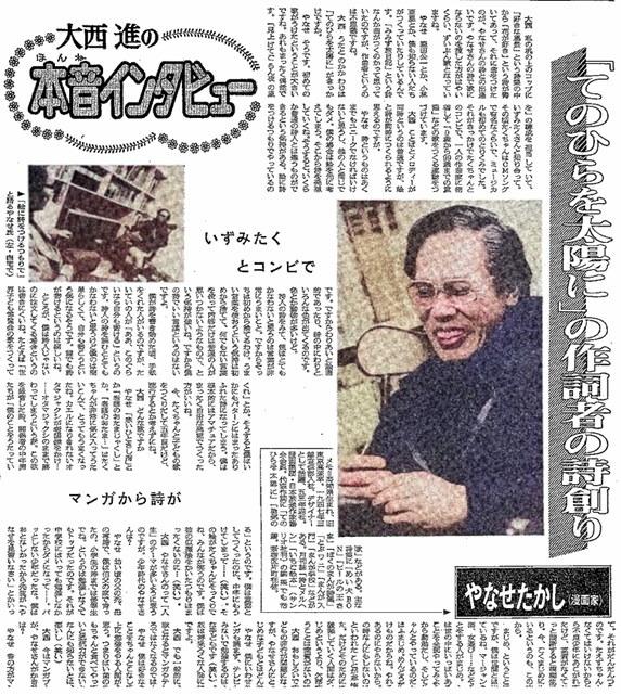 これは1978年12月11日号に本紙に登場したやなせたかしさん。 当時、59歳のやなせさんが何を語っていたか、6面でお読みください。 |