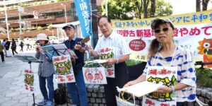 近鉄百貨店前で署名宣伝行動 10月15日 辺野古の工事は遅々として進まず。新基地建設ストップを目指して創作曲を持って宣伝行動に参加しています。 |