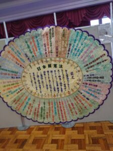 商社で働く人たちで結成された商社九条の会。九条の会は1990年代に産声を上げ、2004年ごろに様々な分野・業種による九条の会が結成されました。 商社九条の会も2005年設立で今年は20周年。 その記念に2m四方の大きな壁かけが作られました。 まん中に前文、左から第1章天皇でスタートして左回りで日本国憲法のタイトルが記されています。 |