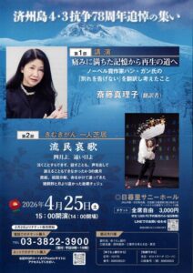 | 済州島4・3抗争78周年追悼のつどい 4月25日 東京・日暮里サニーホール残念ながらチケットはすでに完売だそうです。 詳細はこちらで |
