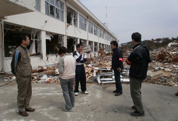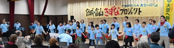 | その4日後、大空へ飛べのメンバー3人が富山から宮城を訪問。様々な追悼式に参列しました。 3月11日には宮城のうたごえ主催の追悼の会に参加。 旧大川小学校卒業生らの作詞「こころのつばさ」の歓迎演奏を受けました。 |