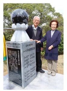| 碑のデザインは国連で初めて被爆者として核兵器廃絶を訴えた故山口仙二さんの母校、長崎県立長崎工業高等学校生によるものです。 除幕式で長崎のうたごえのみなさんは「9条は宝」を演奏しました。 |