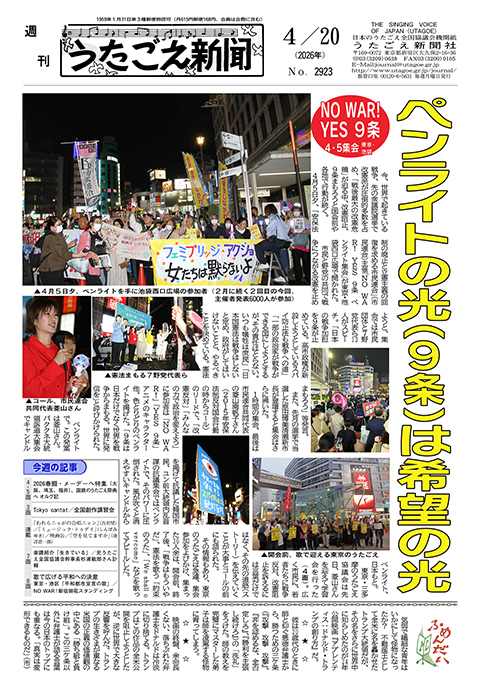 2009年1月26日 「パレスチナ、そこにある暮らし・詩(うた)」、連日報道されるイスラエル軍のパレスチナ・ガザへの空爆。フォトジャーナリストの古居みずえさんとNPOパレスチナキャンペーン土井幸美さんに取材(1・4・5面)。 好評の新連載「愛唱歌世界めぐり」はロシア編②「カチューシャ」。そのリズミカルな詩と曲の背景を探る。 「だん2ファイト」は立命館大学「若者」OB会合唱団をズーム(3面)。 「ヒットチャートウォッチング」は話題の「ユニコーン再結成」にスポットをあてる(7面)。